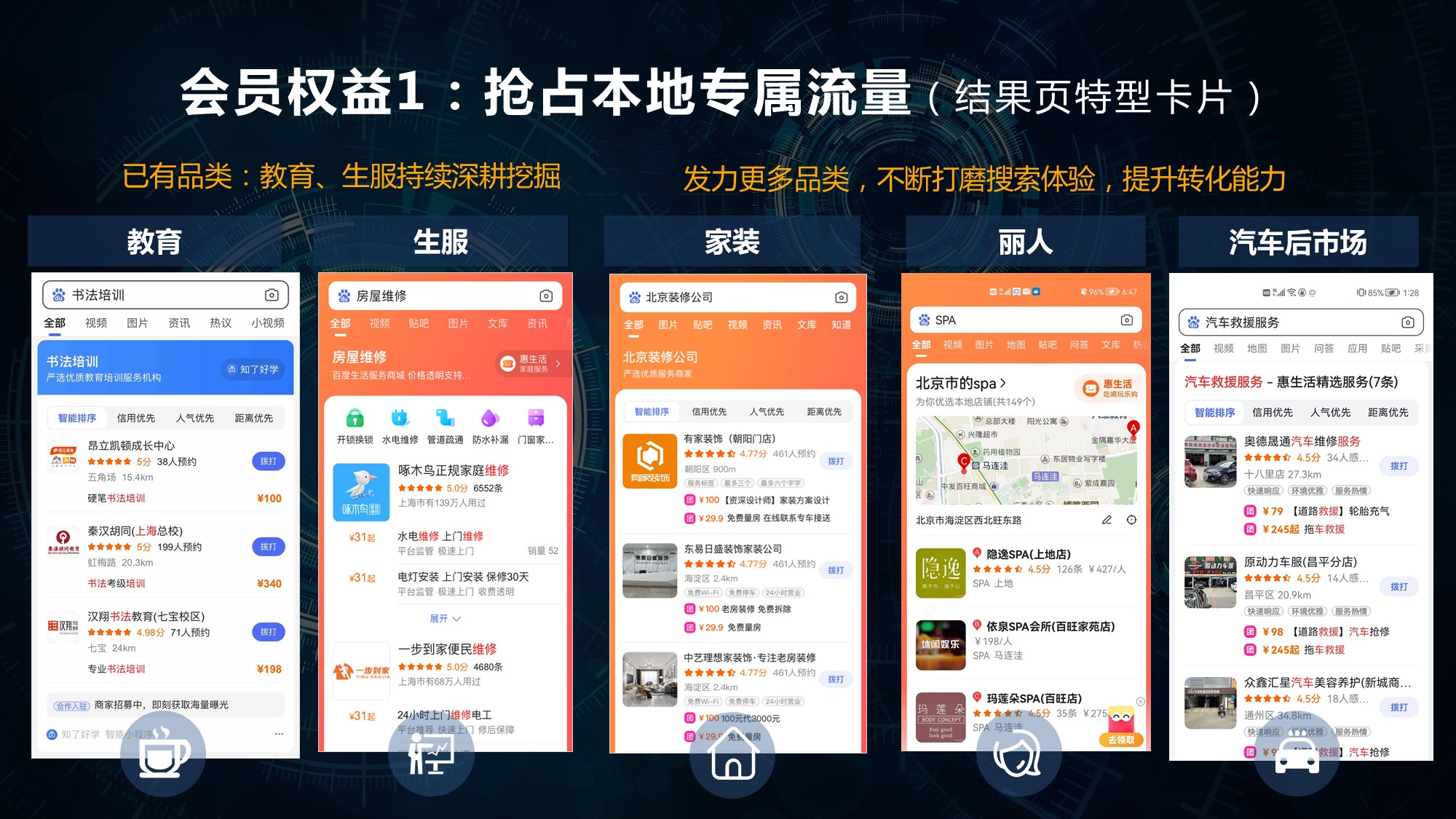 本地會員是面對中小商家的普惠型獲客解決方案,用海量專屬流量扶持本地商家成長,面向五大品類開放會員產(chǎn)品售賣,分別為:生活服務(wù)、教育培訓(xùn)、房產(chǎn)家居、汽車服務(wù)和麗人。